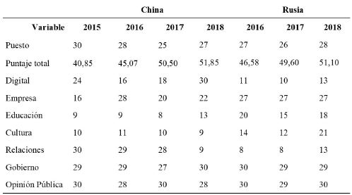 El índice de soft power ( McClory, 2010) se compone de seis dimensiones: digital, empresa, educación, cultura, relaciones, gobierno y opinión pública. Para el caso de China, el país ha venido ganando posiciones en el uso de este tipo de poder. La estrategia de promoción de cultura e idioma con los institutos Confucio se ve reflejada en el incremento del índice de educación. Adicionalmente, los esfuerzos en posicionar sus empresas e inversión también se evidencian en el índice de empresa. Con respecto a los indicadores digital y cultural, la mejora no ha sido significativa. En ambos ítems China cuenta con una gran capacidad de la cual puede tomar ventaja: una cultura milenaria y una inversión sostenida en ciencia y tecnología desde inicios del siglo XXI.