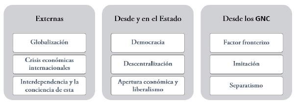 Aun así, los esfuerzos por identificar las causas no han sido pocos, como tampoco lo son las causas propuestas. Si bien algunas de ellas son complementarias o al menos no contrarias entre sí, es cierto que muchas veces resultan vagas ( Totoricagüena, 2005). En consecuencia, las causas son poco útiles al momento de definir el fenómeno y por ello se prefiere poner la atención en los motivos y objetivos. Sin embargo, a fin de presentar el debate, es importante realizar una somera revisión de las causas más frecuentes en la literatura. Estas han sido agrupadas en tres categorías: las que responden a crisis o cambios en el sistema internacional, las relacionadas a cambios en el Estado, y las generadas desde los propios gobiernos no centrales.