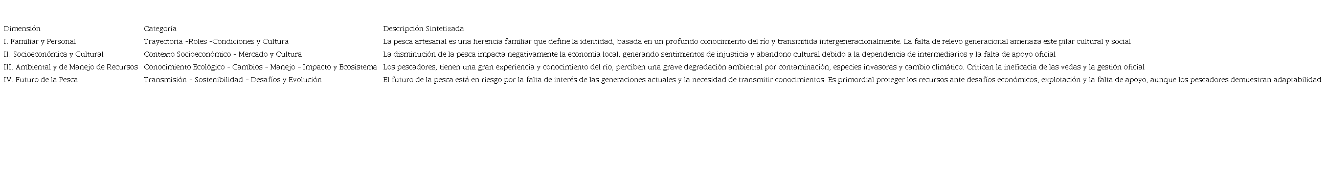 Los resultados se sintetizan en cuatro dimensiones clave (Tabla 1), ofrecen una mirada multifacética a la realidad de las comunidades de pescadores artesanales del Río Negro. Este análisis se enriquece al contrastar y complementar la información obtenida con las metodologías etnogeográficas descritas, revelando no solo qué se encontró, sino también cómo el enfoque con los actores del territorio permitió descubrir estas complejas dinámicas.