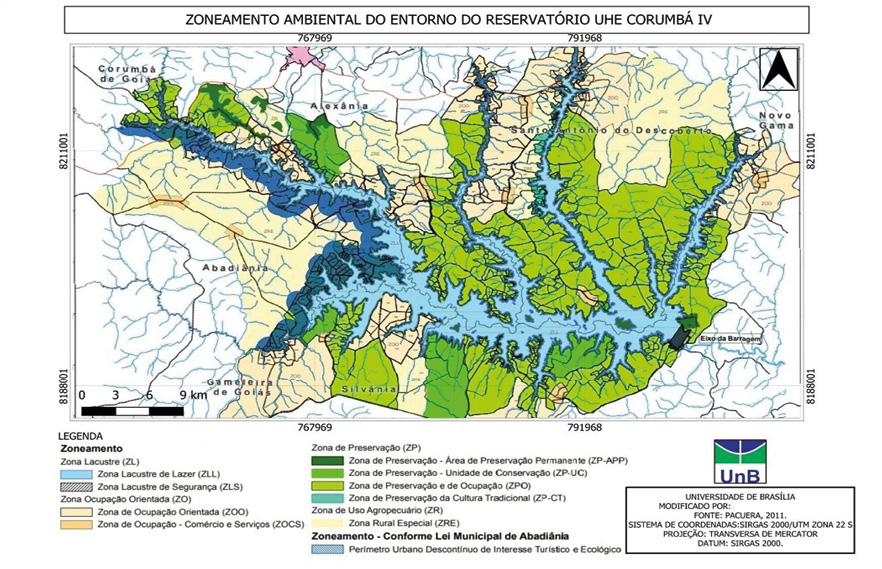 Para tentar mitigar esses problemas, a empresa Corumbá Concessões S.A. fez um zoneamento destinado a servir como base para o manejo ambiental da área estudada. Conforme o planejamento e os critérios estabelecidos no Plano Ambiental de Conservação e Uso do Entorno de Reservatórios Artificiais (PACUERA) de 2011, foram definidas quatro macrozonas de atuação. Cada uma dessas macrozonas possui zonas específicas, com diferentes níveis de restrição e diretrizes para o uso ambientalmente correto do solo: a Zona Lacustre (ZL), a Zona de Preservação (ZP), a Zona de Ocupação (ZO) e a Zona Rural (ZR) (Figura 6).