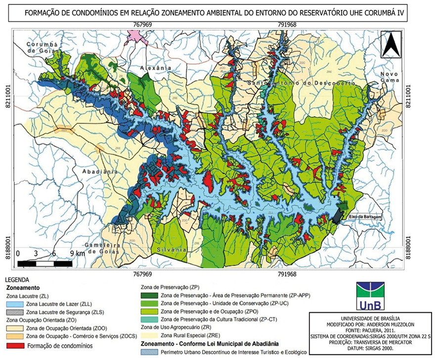 A análise demonstrou que essa ocupação não respeitou o zoneamento ambiental do PACUERA (BRASIL, 2002), um instrumento que complementa o Código Florestal Brasileiro (BRASIL, 2012). A sobreposição dos mapas mostrou que áreas destinadas à conservação e preservação foram ocupadas por novos condomínios, principalmente nos municípios de Alexânia e Abadiânia, pressionando a Área de Preservação Permanente (APP) no entorno do lago.