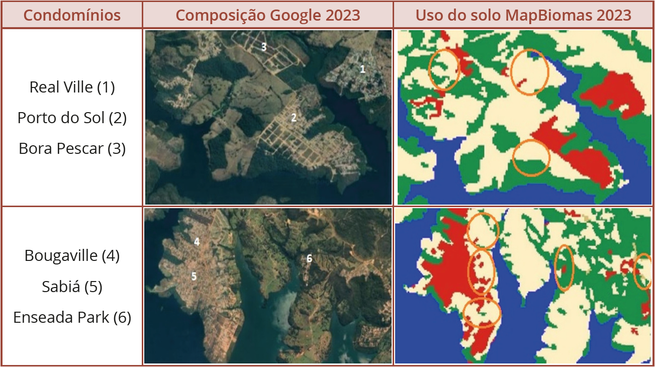 Assim, decidiu-se mapear manualmente as áreas com arruamentos na paisagem estudada (com composição de imagens fornecidas pela Google para o ano de 2023, com resolução de 0,5m por 0,5m) , a fim de obter uma aproximação maior com a realidade e identificar os condomínios ainda em formação, visto que em função da resolução espacial trabalhadas (30 metros por 30 metros) pelo MapBiomas os arruamentos e alguns locais com pouca densidade de construções são incluídas em outras categorias, que não a urbanizada (neste exemplo, como agropecuária), como pode-se ver nas localidades circuladas em laranja (Tabela 2) que eram novas formações de condomínios porém foram classificadas como agropecuária em função da grande presença de gramíneas e pouca densidade de construções.