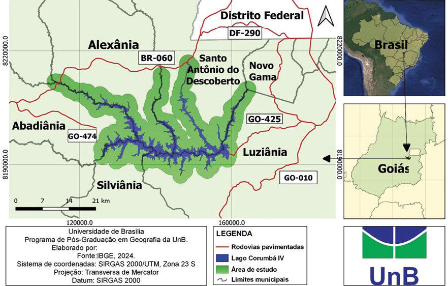 Este estudo foi realizado em uma área que sofre influências diretas da construção do reservatório da Hidrelétrica Corumbá IV, composta por uma faixa de 1,2 km a partir das margens do reservatório, devido à intensa dinâmica da paisagem causada pela expansão dos perímetros urbanos dos municípios afetados. Essas localidades incluem os municípios de Luziânia, Silvânia, Novo Gama, Santo Antônio do Descoberto e Alexânia, que são diretamente impactadas pela formação do lago Corumbá IV (Figura 1). Destaca-se que o Lago fica em área que era considerada inicialmente rural, sem ligação direta com os núcleos urbanos e que hoje abastece 1,3 milhões de pessoas do Distrito Federal com água potável.