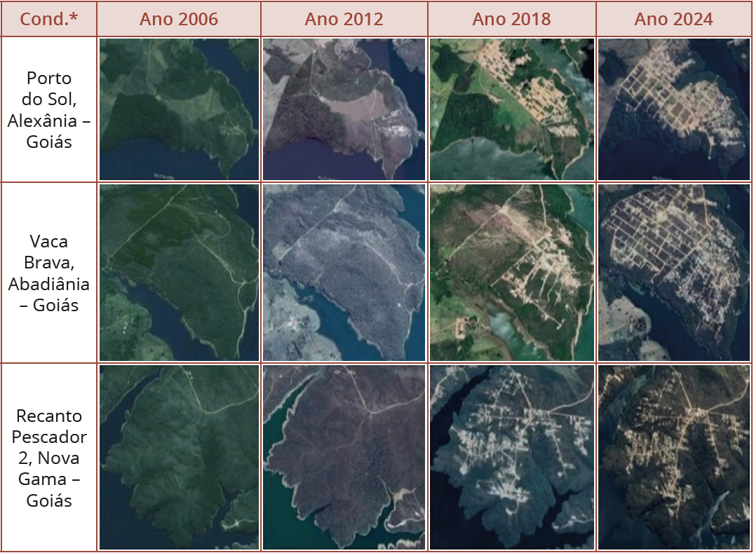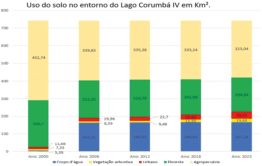 Fonte: Banco de imagens GOOGLE™ (2024). Elaborado por: Anderson Muzzolon.A criação do Lago Corumbá IV no ano de 2005 reconfigurou a paisagem local, impulsionando uma urbanização acelerada e desordenada. A área, antes rural, passou a integrar o perímetro urbano descontínuo dos municípios que o margeiam, com a expansão urbana crescendo de 19,96 km² em 2006 para 53,27 km² em 2023. Essa expansão, que substituiu principalmente pastagens e vegetação de Cerrado, gerou um novo padrão de uso e ocupação do solo.