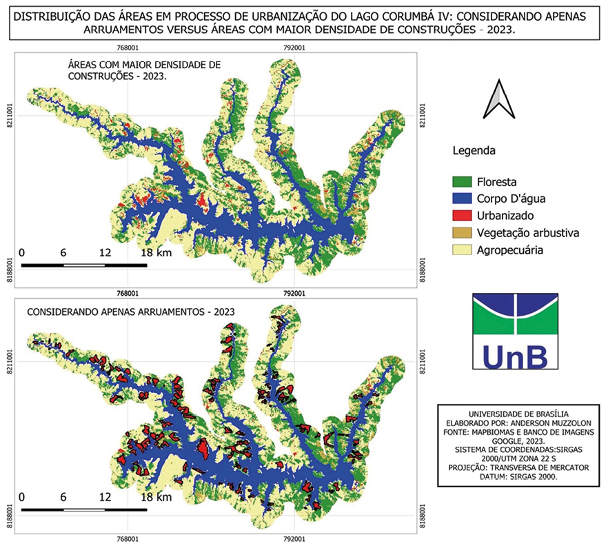 Neste levantamento foram categorizados os setores em Floresta (localidades com matas de galeria e cerradão), Corpo D’água (lagos e rios), Urbanizado (territórios com arruamentos e construções) Vegetação Arbustiva (cerrado stricto sensu e campos sujos) e agropecuária (pastagens e agricultura). Com base nos indicadores levantados pelo mapeamento acima, verificou-se que as áreas urbanizadas na área de estudo começaram a se formar logo após a inauguração do empreendimento e têm se expandido progressivamente, passando de 19,96 km² no ano de 2006 para 39,32 km² em 2023. Esse crescimento se deu em espaços que eram compostos pela agropecuária e manchas florestais (Gráfico 1).