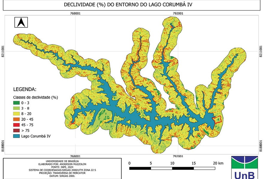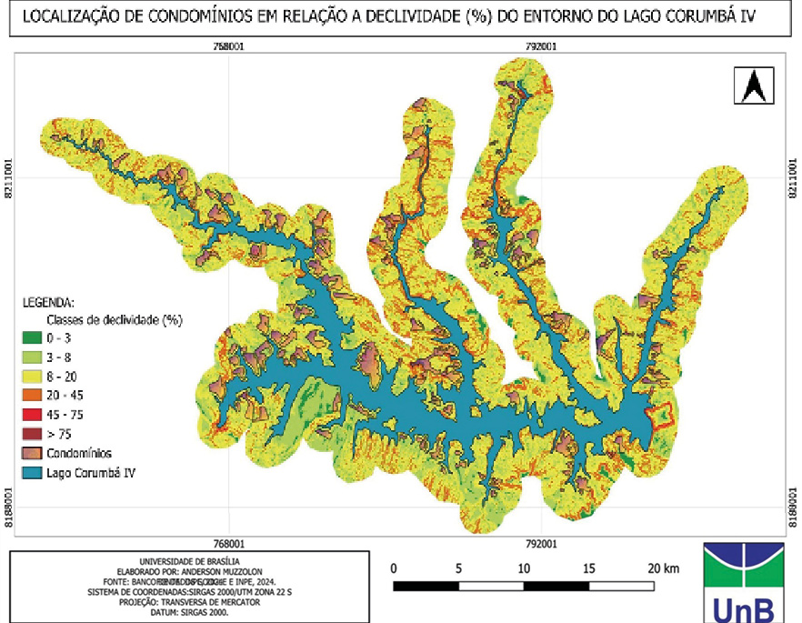 A análise de declividade mostrou que 2,56 km² das áreas urbanizadas estão em terrenos com forte inclinação (entre 20% e 45%), tornando-os mais vulneráveis a processos erosivos e deslizamentos. Apesar de essa área de risco representar apenas 0,4% do total do território estudado (excluindo a superfície do lago), o acompanhamento rigoroso desse processo é essencial para evitar que essa ocupação em locais inadequados se expanda.