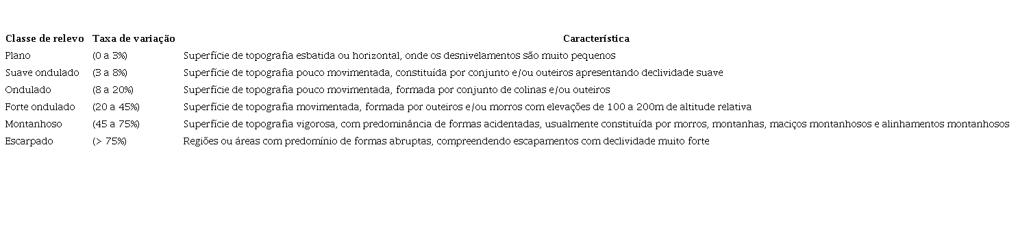Inicialmente, recortou-se o MDE para delimitar o sítio de estudo, permitindo uma análise focada na paisagem de interesse. Em seguida, calculou-se a declividade em porcentagem. Para assegurar a precisão e padronização da análise, usou-se a classificação de declividade sugerida pela Embrapa (1979), conforme apresentado na Tabela 1. Essa classificação estabelece categorias claras para diferentes graus de inclinação do terreno, proporcionando uma base confiável para a interpretação dos resultados.