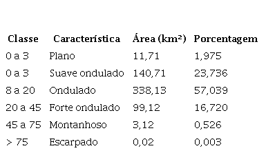 A declividade da área de estudo foi mapeada usando um Modelo Digital de Elevação (MDE), com resolução de 30m, obtido a partir da carta topográfica TOPODATA 16S495ZN, cujos dados foram fornecidos pela missão SRTM (Shuttle Radar Topographic Mission) e disponibilizados na Base de Dados Topodata do INPE (Instituto Nacional de Pesquisas Espaciais).