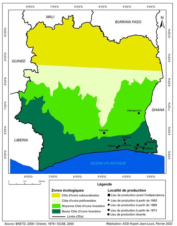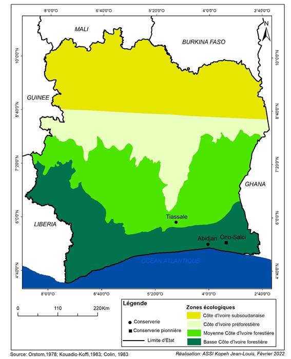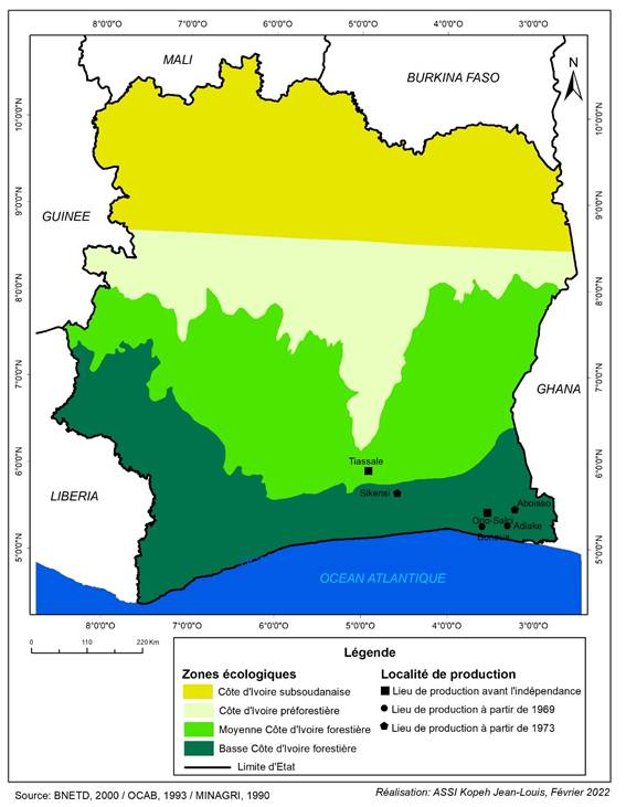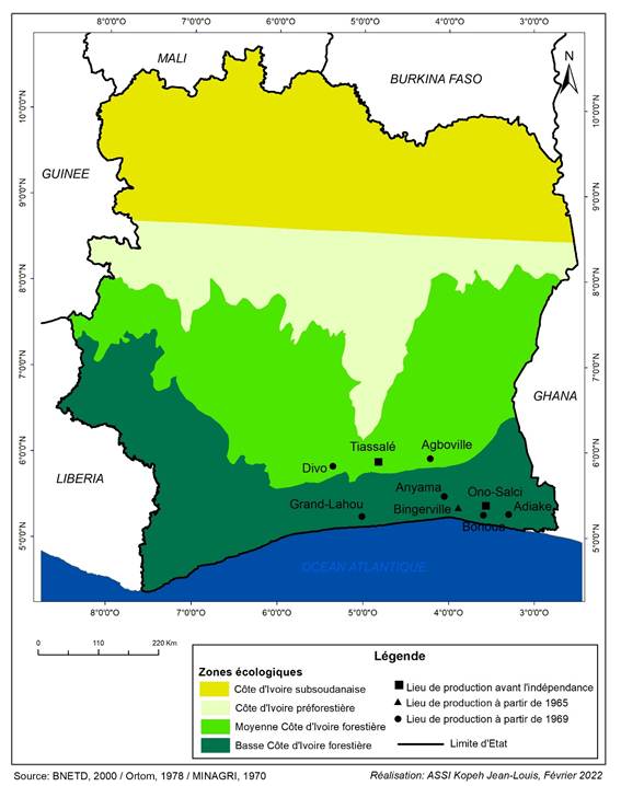 À l’analyse de la carte 1, il ressort que la production de l’ananas colonial est l’apanage de trois localités fortement impliquées dans l’ananas de conserve. On observe que les trois localités sont toutes dans le sud forestier. On constate une inégale répartition de l’activité à l’échelle nationale. Une préférence est accordée aux zones agroécologiques de la basse forestière (Abidjan et Ono-salci) et moyenne forestière (Tiassalé). Durant l’époque coloniale, chaque conserverie assure la transformation des fruits récoltés, à partir d’un bloc de culture, généralement proche de l’usine, ou d’exploitations villageoises dispersées dans un rayon de vingt kilomètres des villages. Cette géographie volontaire de l’activité dans les environs d’Abidjan repose sur le fait que l’ananas, fruit fragile devait être produit à une distance de 100 kilomètres d’Abidjan et de son port.