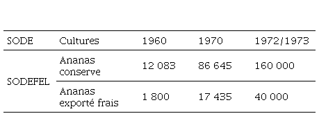 Le besoin de l’ananas sur le marché européen contraint les conserveries à produire plus (la Côte d’Ivoire étant le premier fournisseur sur le marché européen). Une réorganisation du mode de production des petits planteurs est alors envisagée à travers la Société de Développement des Fruits et Légumes (SODEFEL). Cette structure regroupe les petits planteurs jusque-là disséminés dans les terroirs sur des blocs de culture mécanisée en les organisant en Groupements à Vocation Coopérative (GVC) (Colin, 1984). Le tableau ci-après rend compte de l’impact de la SODEFEL sur la production de l’ananas.