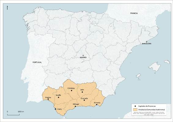 Asimismo, conviene situar geográficamente el objeto de estudio: Andalucía, comunidad autónoma del sur de España, limita al norte con Extremadura y Castilla-La Mancha, al este con Murcia, al sur con el mar Mediterráneo y Gibraltar, y al oeste con Portugal y el océano Atlántico. Esta localización la convierte en un espacio fronterizo, abierto y estratégico para comprender la interrelación entre dinámicas globales del turismo y procesos regionales de formación e investigación universitaria.