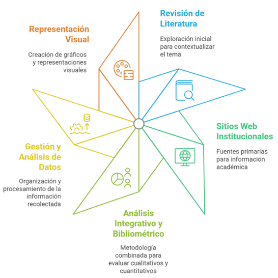 El análisis integrativo se sustentó en una revisión documental de carácter descriptivo y comparativo, que complementó los resultados bibliométricos mediante la evaluación de dimensiones organizativas y académicas de las universidades. Este proceso incluyó la revisión de objetivos formativos, competencias, estructura curricular y perfiles docentes, considerando su formación, trayectoria y participación en investigación. Más que un análisis cualitativo en sentido estricto se trató de una sistematización de información institucional disponible públicamente, que permitió comparar estructuras académicas y organizativas entre universidades, identificando semejanzas y diferencias relevantes. Este enfoque permitió comprender mejor la relación entre aspectos académicos y organizativos, en línea con metodologías utilizadas en estudios comparativos de educación superior (Oliva y Lonardi, 2017), aunque siempre reconociendo el carácter secundario y normativo de las fuentes analizadas.