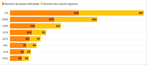 En lo que respecta a la capacidad formativa, las diferencias en la demanda estudiantil y en la ocupación de plazas parecen indicar que el conocimiento no se distribuye de manera homogénea, sino que estaría condicionado por la inserción espacial de las universidades en redes urbanas y turísticas más amplias. La centralidad geográfica y simbólica de ciudades como Sevilla, Málaga o Granada tiende a traducirse en ventajas acumulativas que refuerzan su capital académico, mientras que otras instituciones enfrentan mayores limitaciones. Este hallazgo puede considerarse coherente con la premisa de que el saber tiene geografía: se produce y circula desde lugares concretos y bajo condiciones territoriales específicas.