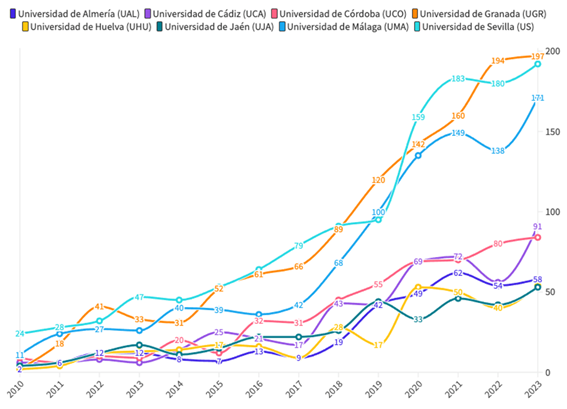 Así, mientras la Universidad de Sevilla y la de Málaga tienden a destacar por el volumen absoluto de publicaciones, la Universidad de Granada resalta por su productividad relativa, alcanzando 2,4 publicaciones por docente en 2023. Este dato puede interpretarse en el sentido de que la productividad científica no depende únicamente del tamaño del cuerpo docente, sino también de estrategias específicas de acumulación de capital académico y de inserción en redes internacionales de colaboración (Tribe & Liburd, 2016).