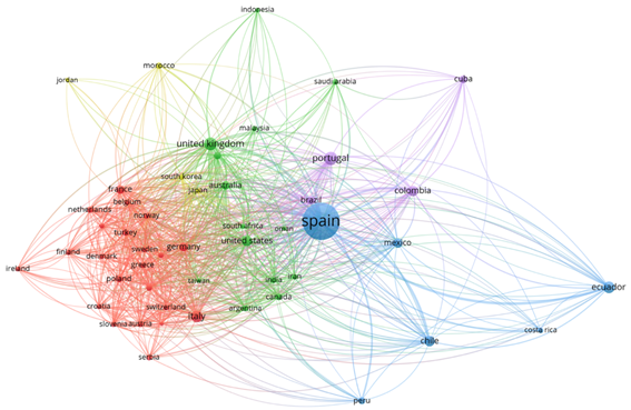 La colaboración entre España y los países de Iberoamérica, como Ecuador, Chile, Colombia, México, Argentina y Brasil, emerge como un eje central en la construcción de redes de investigación en turismo. Estas relaciones reflejan la relevancia de los lazos culturales y lingüísticos compartidos, que actúan como un elemento facilitador en la creación de vínculos científicos sólidos. El caso de Ecuador destaca especialmente, consolidándose como un nodo relevante en la red de colaboración. De manera similar, Chile también se presenta como un actor significativo dentro de esta red, mostrando una colaboración activa y sostenida con instituciones españolas.