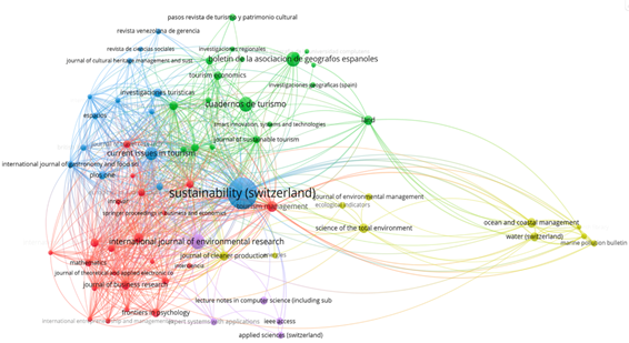 El análisis del gráfico destaca una red compleja de colaboración y publicaciones que evidencia la amplia conexión entre investigadores y sus contribuciones científicas en el ámbito del turismo. La centralidad de la revista Sustainability (Suiza), clasificada como de alto impacto (Q2) en el Journal Citation Reports (JCR) de 2023, subraya su papel estratégico en la producción y difusión de investigaciones científicas.