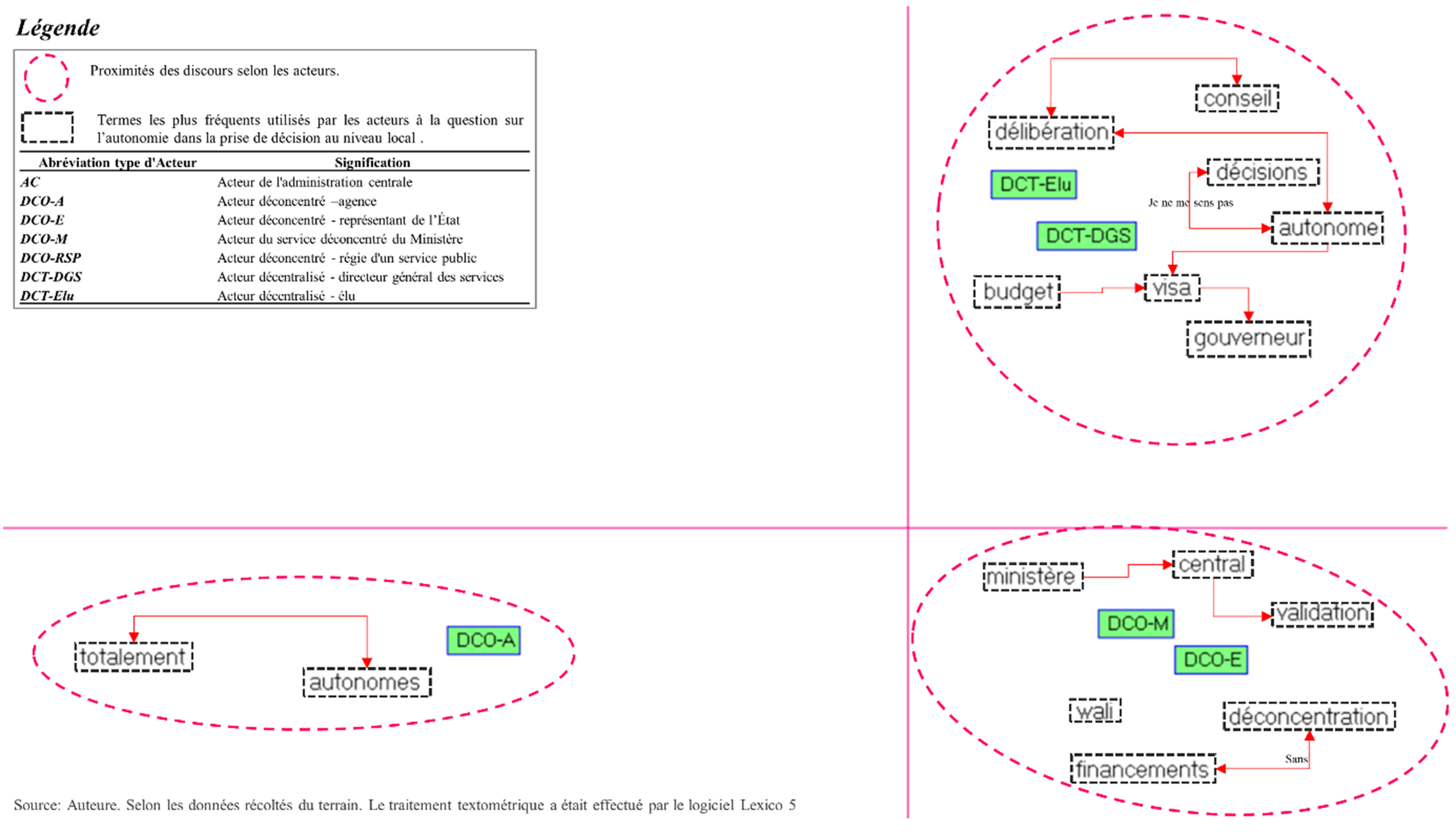 Les résultats de notre enquête (Figure 6) montrent que le degré d’autonomie dans la prise de décision varie significativement selon qu’il s’agisse d’acteurs déconcentrés ou décentralisés (Keuffer, 2016). Pour les premiers, cette autonomie dépend du type de ministère concerné (ministères de souveraineté ou ministères sectoriels) et de la nature de l’entité locale (agence, direction régionale, service externe).