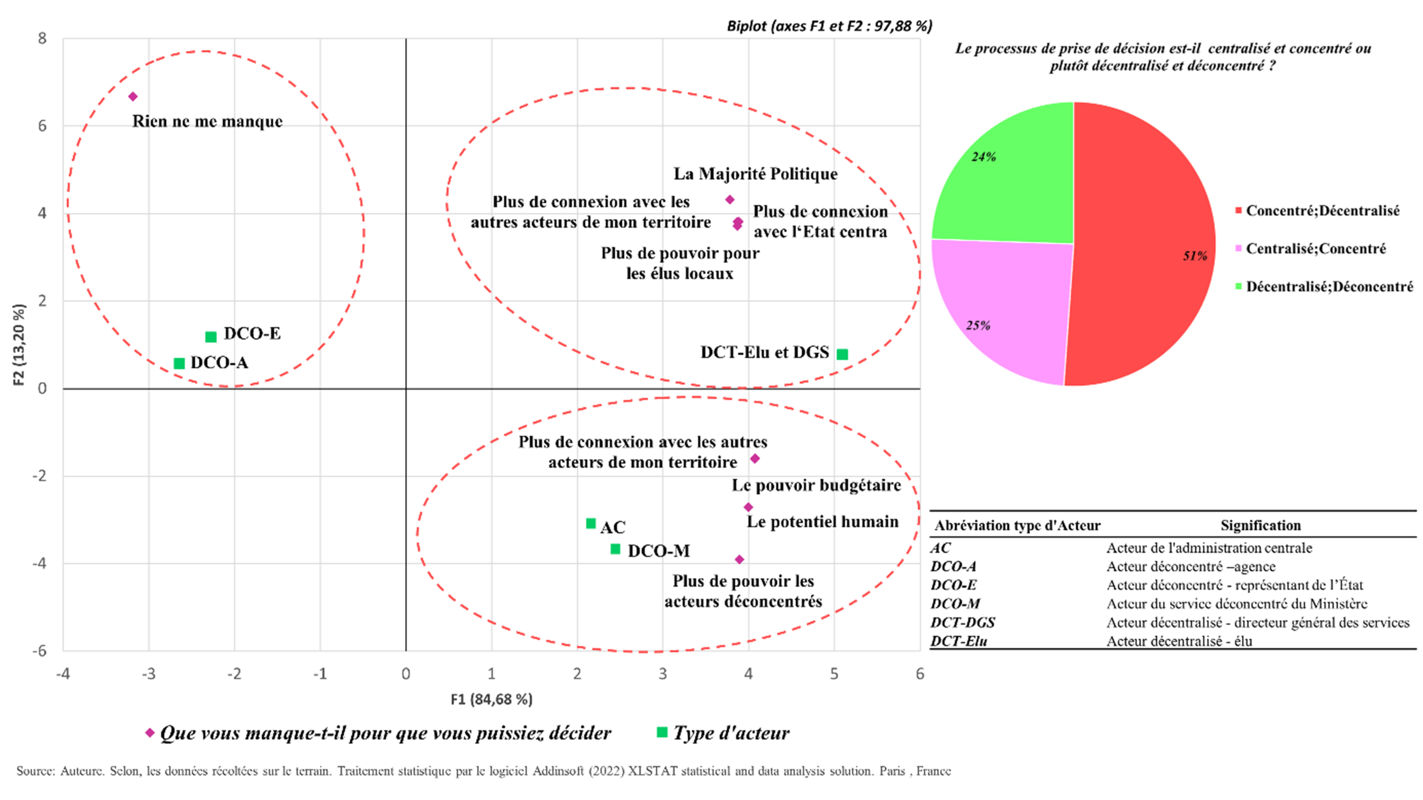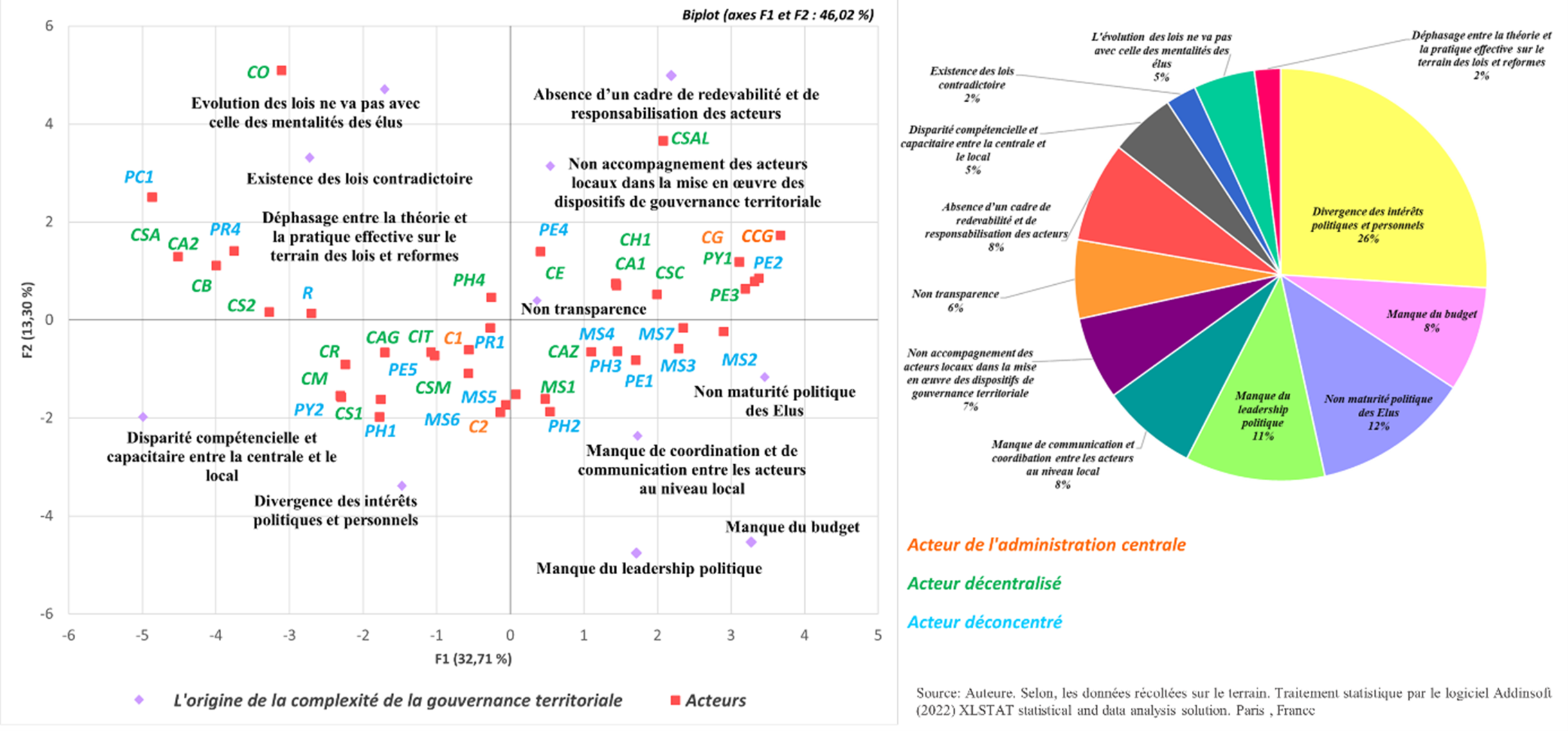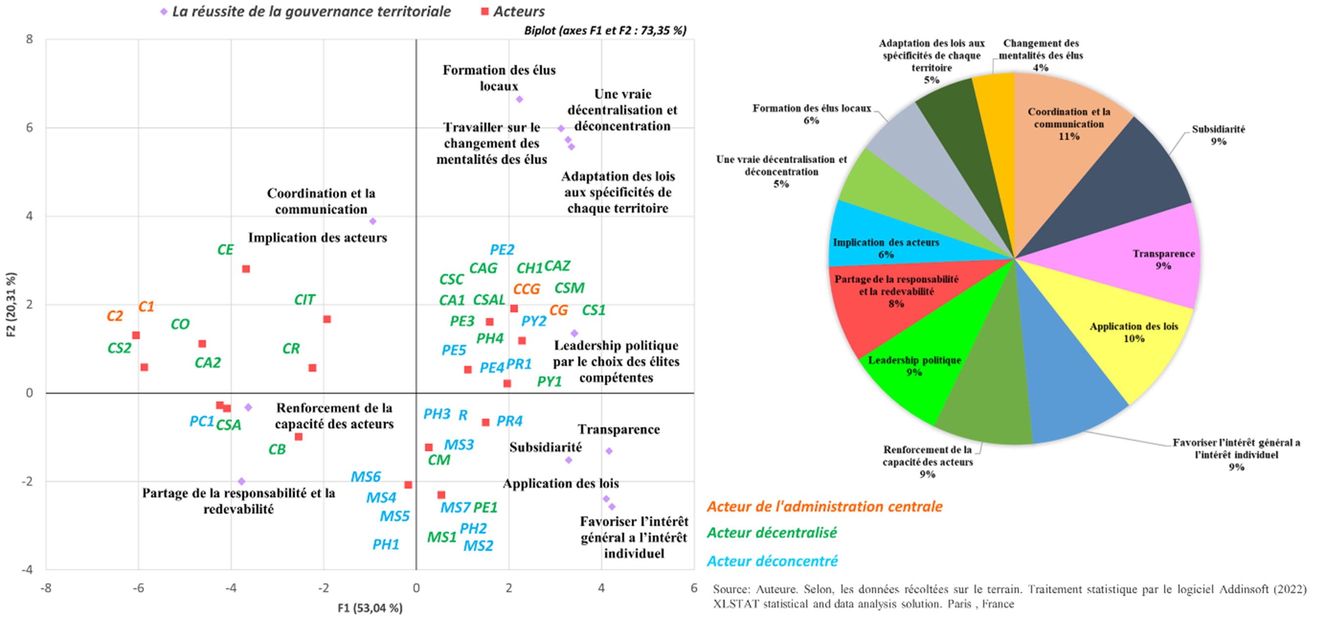 Pour l’approche quantitative, nous avons adressé un questionnaire avec des questions fermées à l’ensemble des acteurs interviewés (55 acteurs). L’analyse des résultats a été effectuée par le logiciel XLSTAT (licence XLSTAT BASIC+). Dans nos analyses, on s’est basé sur le tri croisé d’une part, et d’autre part sur l’analyse en composante principale pour la visualisation des observations (correspondant dans notre cas aux réponses des acteurs) dans un espace à deux ou trois dimensions, afin d’identifier des groupes homogènes d’observations, ou au contraire des observations atypiques ; la visualisation des corrélations entre les modalités des variables (correspondant dans notre cas au codes, types et échelle d’intervention des acteurs interrogés).
