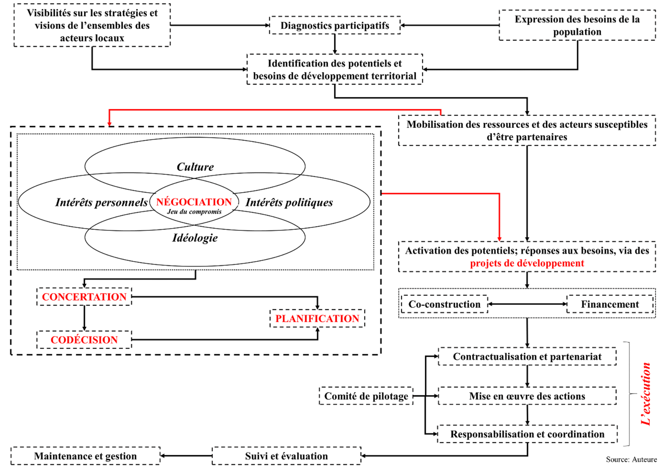 Le croisement des définitions de la gouvernance territoriale selon divers auteurs (PNUD, 2003 ; Lardon et al., 2008 ; Ramírez, 2022 ; Yilmaz, 2023 ; Torre, 2023) avec la réalité observée sur le terrain révèle un hiatus important entre les deux. Les définitions classiques n’intègrent pas les dimensions idéologiques et culturelles des acteurs, alors même que celles-ci interviennent systématiquement dans la prise de décision. De plus, ces définitions associent la réussite de la gouvernance à l’application de « bonnes pratiques » souvent standardisées, alors qu’elles varient selon les sociétés et parfois même selon les territoires. Cette confrontation des définitions montre que la gouvernance territoriale marocaine mérite d’être repensée pour mieux refléter ses réalités. Nous proposons ainsi la définition suivante :