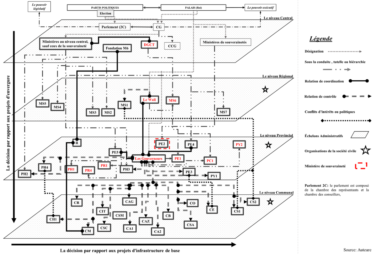 La bonne ou la mauvaise gouvernance (Lesage, 2022), ainsi que l’échec ou la réussite des projets, résultent d’un processus complexe qui exige un écosystème favorable. Il ne s’agit pas de la responsabilité d’un seul acteur ni d’un simple cadre juridique, mais bien d’un système territorial complexe où un maillon faible peut parfois provoquer, directement ou indirectement, des dysfonctionnements. De plus, la simple application des lois peut engendrer conflits et blocages dans les projets, car au Maroc, un écart significatif existe entre les textes législatifs et les réalités locales, sans compter les fréquentes contradictions entre lois sectorielles. L’analyse de divers projets dans la région de Marrakech-Safi révèle que la nature des relations entre acteurs se décline en trois types : coordination, contrôle et conflits d’intérêts ou politiques (Figure 10).