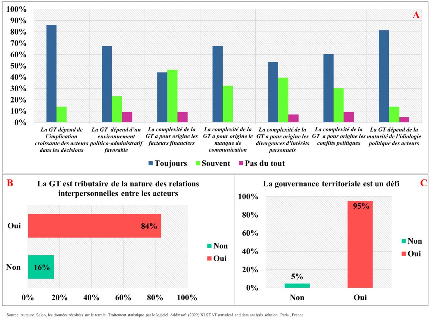 Une communication efficace entre les acteurs locaux est essentielle, car elle permet de transmettre à chacun les informations pertinentes en temps utile, garantissant ainsi une action efficace et efficiente (Butt et al., 2016). La gouvernance territoriale est un processus très complexe, fondé sur la coopération et la coordination des acteurs, tant horizontalement que verticalement, dans un cadre de subsidiarité. Elle vise un objectif de développement territorial défini conjointement à différentes échelles spatiales, afin d’assurer la cohérence des actions menées. Les principaux défis résident donc dans la conciliation de la coordination horizontale et verticale entre les échelons territoriaux, ainsi que dans la coordination entre les différentes politiques sectorielles. La majorité des acteurs interrogés considèrent la gouvernance territoriale comme un défi complexe, principalement lié à des facteurs financiers, au manque de communication, aux divergences d’intérêts personnels et aux conflits politiques (Figure 11C). Ce processus dépend également des relations interpersonnelles entre acteurs, de leur implication dans la prise de décision, d’un environnement politico-administratif favorable, ainsi que de la maturité et de l’idéologie politique des acteurs concernés (Figure 11 A, B).
