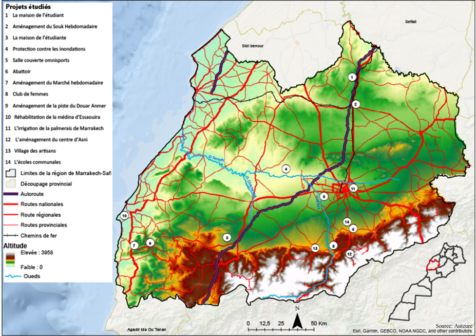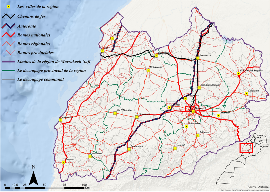 Notre zone d’étude est la région Marrakech-Safi. C’est l’une des douze régions du Maroc, créée par la loi 114-14. Limitée au Nord, par la Région de Settat-Casablanca. Au Sud, par la chaine montagneuse du Haut Atlas (régions du Souss-Massa et de Drâa-Tafilalet). A l’Est, par la Région Béni-Mellal-Khénifra et à l’Ouest par l’océan Atlantic. Cette nouvelle entité territoriale comprend la préfecture de Marrakech Chef-lieu de la région et les sept provinces d’Al Haouz, Chichaoua, El Kelâa des Sraghnas, Essaouira, Rhamna, Safi et Youssoufia (Figure 2). Elle reprend l’ancienne région de Marrakech-Tensift-Al Haouz à laquelle se joignent désormais les provinces de Youssoufia et de Safi.