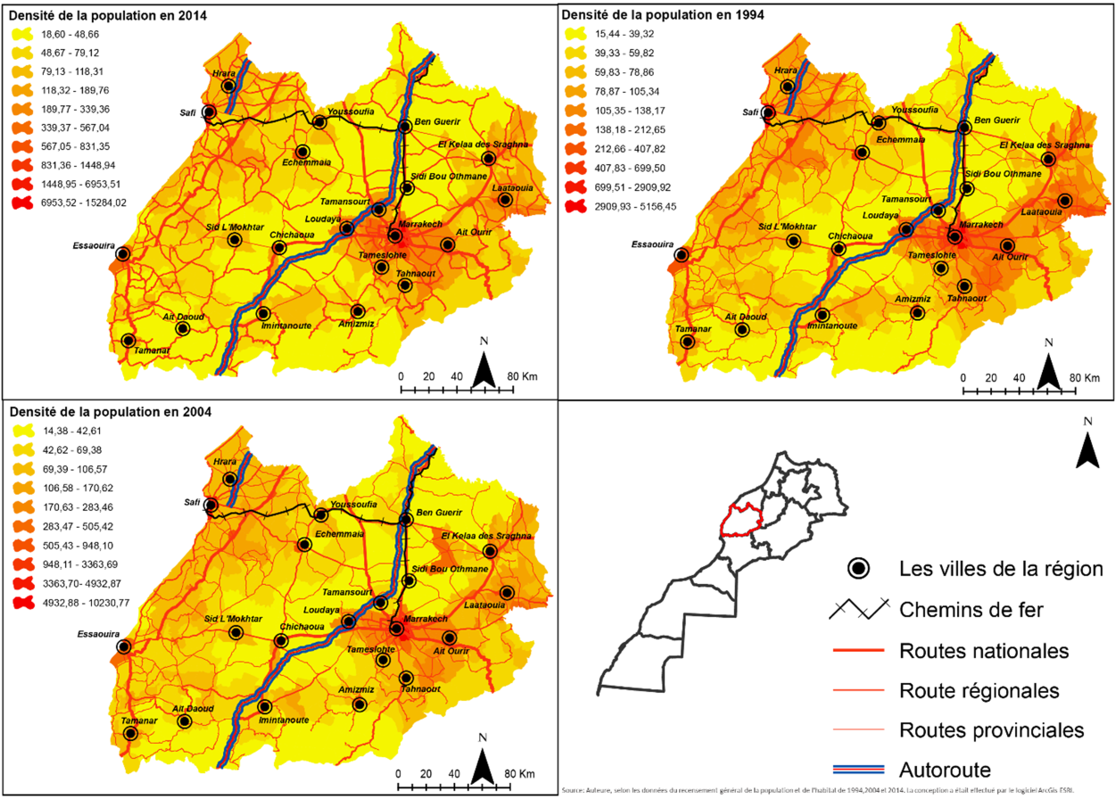 L’adhésion de ces deux provinces ont permis à l’ancien territoire régional de gagner une superficie additionnelle de 13.141 km2 (en passant de 31.160 à 44.301km²), et a permis également à sa population de passer de 3.102.652 (recensement de 2004) à 4.520.569 habitants selon le recensement de 2014, soit une augmentation absolue de 1.417.917 habitants (Figure 3). Elle occupe ainsi la 3ème place, en termes de poids démographique, après la région du Grand Casablanca-Settat (20.27%) et de Rabat-Salé-Kénitra (13.53%). Entre 2004 et 2014, la population régionale a crû au rythme moyen annuel de 1.27%, soit un rythme plus accéléré que celui de la période intercensitaire précédente (1.17% entre 1994-2004) et inférieure à la moyenne nationale qui est de 1.32%. Par ailleurs, ce Taux d’Accroissement Annuel Moyen (TAAM) est plus important en milieu urbain qu’en milieu rural. En effet, tandis que le milieu urbain enregistre un TAAM de 1.68%, le milieu rural n’affiche qu’un taux de 0.92% (Monographie e SDAU de Marrakech, 2017).