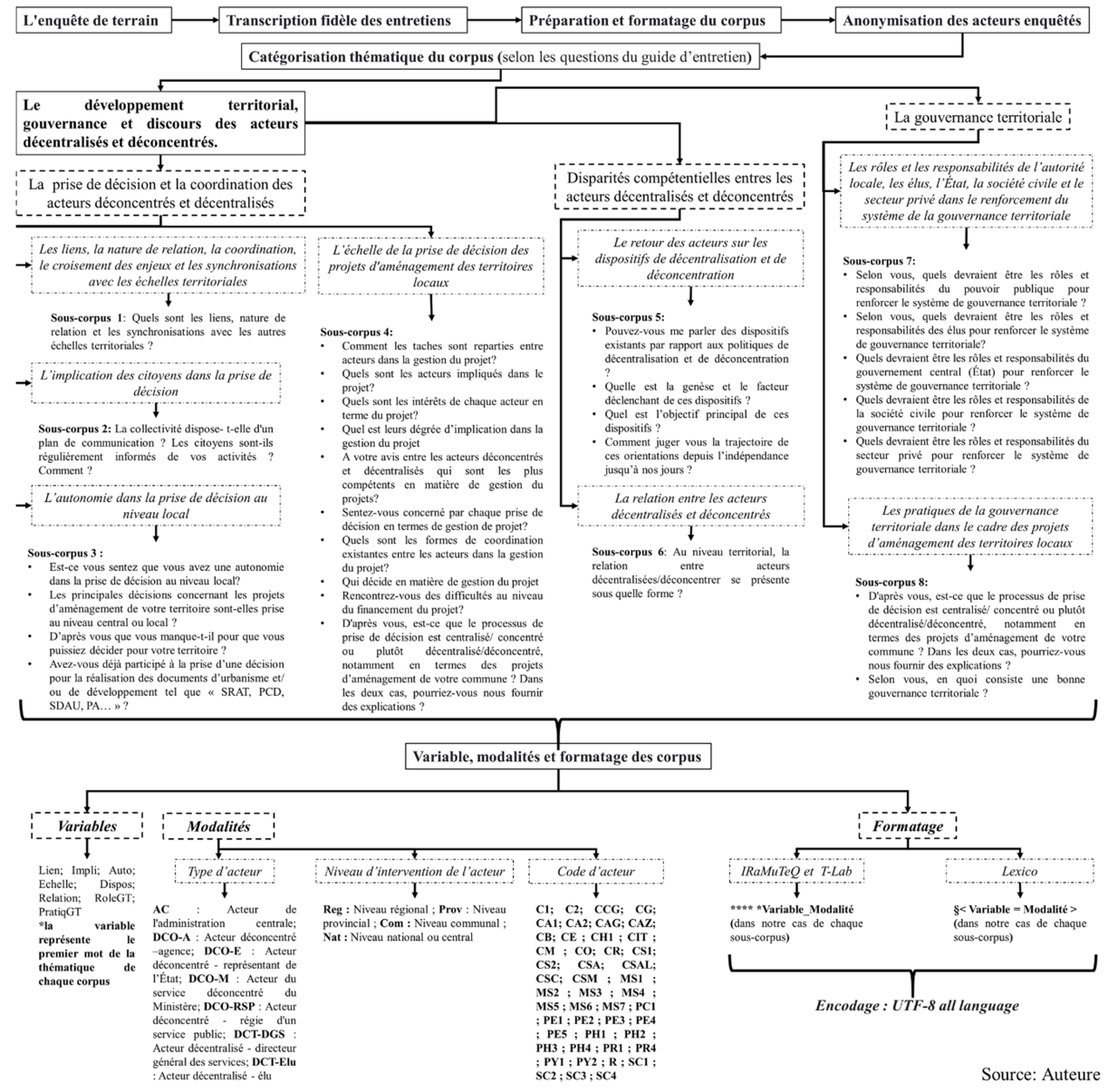 Pour l’approche qualitative, à l’aide d’un guide d’entretien nous avons interviewé 55 acteurs (qui représente l’ensemble des acteurs impliquées dans chaque projets). Dans les acteurs interviewée nous avons une représentativité de 40% au niveau communal, 35% au niveau provincial, 16% au niveau régional et 9% au niveau national. Une promesse de confidentialité a été faite explicitement aux interviewés avant le début de l’entretient afin de protéger leur vie privée et leurs propres intérêts. Simultanément, des pseudonymes ont été utilisés lors de l’analyse des résultats pour éviter les inconvénients d’un anonymat complet. Pour l’analyse des résultats, nous avons utilisé le logiciel IRaMuTeQ (Version 0.7 alpha 2), T-LAB plus 2022 et Lexico 5. Beta. Ce choix multiple de logiciel est justifié par les besoins en analyses précises qu’un seul logiciel ne pourrait pas fournir. Les corpus qui nous ont servis comme base d’analyses correspondent aux entretiens avec les acteurs retranscrits fidèlement. Avant de procéder aux analyses, nous avons commencé par une préparation et un formatage manuel du corpus, en plusieurs étapes (Figure 5). La première étape est l’anonymisation des acteurs. La deuxième étape correspond à la catégorisation thématique en sous-corpus selon les thèmes. La troisième étape est le formatage (selon les règles de formatage ou balisage de chaque logiciel) des sous-corpus catégorisés et la création de variables (dans notre cas, il s’agit des codes d’acteurs, des types d’acteurs et des échelles d’intervention des acteurs).
