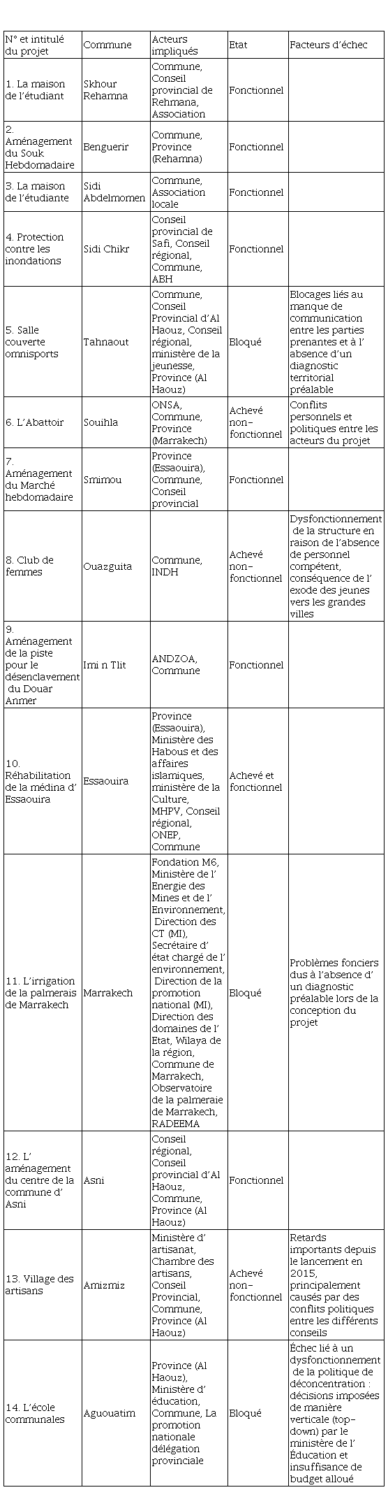 Notre méthodologie repose sur des enquêtes sur le terrain. Nous avons adopté une approche axée sur les projets, consistant à sélectionner des projets spécifiques et à identifier les acteurs impliqués. Cette méthode a été choisie car nous estimons qu’elle offre la meilleure façon de mesurer et d’analyser la gouvernance territoriale, en examinant les interactions et les processus décisionnels des acteurs impliqués dans les projets. Nos investigations ont porté sur 14 projets (Figure 4 ; Tableau 1), sélectionnés selon des critères liés à l’accessibilité géographique, aux données disponibles et nous avons opté pour ceux qui font l’objet d’une convention de partenariat et qui regroupent au moins un acteur déconcentré et un acteur décentralisé.