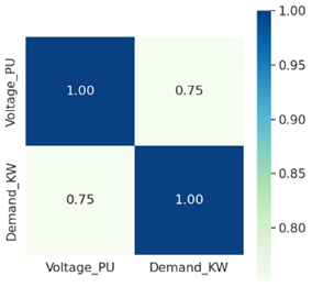To complete the data processing, a correlation matrix was used, because it is a tool that allows identifying the variables that are related to each other. Figure 6 shows a correlation of 0.75 for the selected variables (Voltage in p.u. and power consumed in KW), which indicates that the two variables tend to increase or decrease at the same time, that is, they evolve in the same direction. Therefore, in the loading process, they will be the attributes sent for the design and implementation of the predictive model.