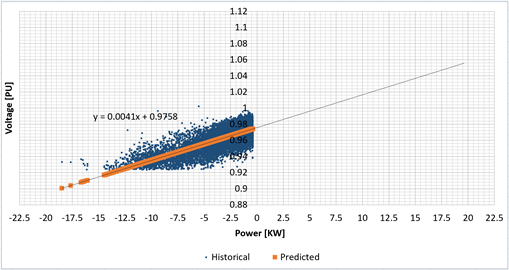 HC Estimation. With the determination of the model that describes the behavior of voltage levels at the point of analysis, it is possible to estimate values of power injected to the low voltage distribution system for a given voltage level. In the case of HC, an active power value is determined for an overvoltage level established by the regulations in force at the analysis location.