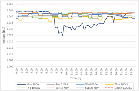 The results obtained from the proposed methodology are used to model a DER system of 18,253 KW [maximum HC calculated], that is connected to the PCC to subsequently perform the analyses in time series of each day of the week, taken randomly from the considered test period. The network modeling and the simulation of power flows in time series were carried out in the OpenDSS software. Figure 8 shows the voltage profiles of the considered node, with the constant HC value determined.