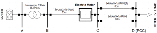 The used ISTER electrical system starts from the 22.8 KV bus that feeds the primary of the 75 KVA; 22.8 KV/220 V three-phase distribution transformer; the low voltage bus is connected to the general meter, and this in turn connects to the Main Distribution Board of the ISTER, considered the PCC for this study. The transformer tap is at step 1 with +1.5 % (line voltage of 223.4 V and single voltage of 129 V). Therefore, the base single-phase voltage considered is 129 V, which corresponds to voltage 1.00 p.u. The network is shown in Figure 2.