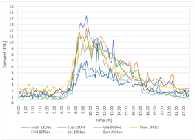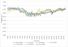 To validate the results obtained from the application of the methodology, a modeling of the ISTER network was carried out in the OpenDSS program, using the physical network data and the demand profiles obtained from the smart measurements. The measurements were performed from September 26 to December 23, 2023, with a period of 5 min. Figure 3 shows the demand profiles and voltages for each day of the week taken randomly within the analysis period.