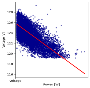 he selected attributes were loaded and separated into two data sets, where 70 % was used for training and 30 % for testing the model; where a and b are the coefficients that allow relating the dependent variable x, which corresponds to the power consumed in KW, with the independent variable y, which represents the voltage in per unit (p.u.) values. To evaluate the performance of the algorithm, the Mean Square Error (MSE), Root Mean Square Error (RMSE), R2, and Mean Absolute Error (MAE) metrics were used.