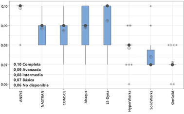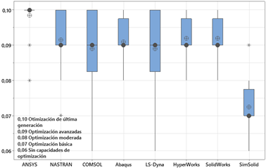 El parámetro Optimización describe las capacidades de optimización del software, incluyendo algoritmos disponibles (por ejemplo, gradiente, evolutivos, etc.) y opciones de restricción y objetivo que permite encontrar diseños óptimos que cumplan con ciertos criterios de rendimiento, mejorando la eficiencia y la innovación en el diseño. La figura 5 muestra que ANSYS se posiciona como líder indiscutible en herramientas de optimización, con un 99.8% de reconocimiento por su tecnología de vanguardia. NASTRAN y COMSOL le siguen con un 83% y 67% de aceptación respectivamente, consolidándose como opciones robustas. Abaqus (58%) y HyperWorks (50%) también ofrecen herramientas avanzadas, aunque con menor reconocimiento. En contraste, LS-Dyna (42%), SolidWorks (33%) y SimSolid (8%) se enfocan en la optimización básica, siendo este último un factor a considerar para análisis complejos en la industria automotriz.