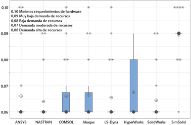El análisis de los requerimientos de hardware para diferentes programas de simulación revela que la mayoría de los programas tradicionales, como ANSYS, NASTRAN, COMSOL, Abaqus, LS-Dyna e HyperWorks, exigen un alto rendimiento del hardware en el 83.33% de los casos. Mientras que SolidWorks muestra necesidades variables, programas como NASTRAN (66.66%) y LS-Dyna (83.33%) casi siempre requieren equipos potentes. En contraste, SimSolid se destaca por su baja demanda de recursos en el 83.33% de los casos, funcionando eficientemente incluso con recursos limitados: un 50% de los casos analizados muestran una demanda muy baja y un 33.33% una demanda baja, convirtiéndolo en una opción más accesible en términos de hardware.