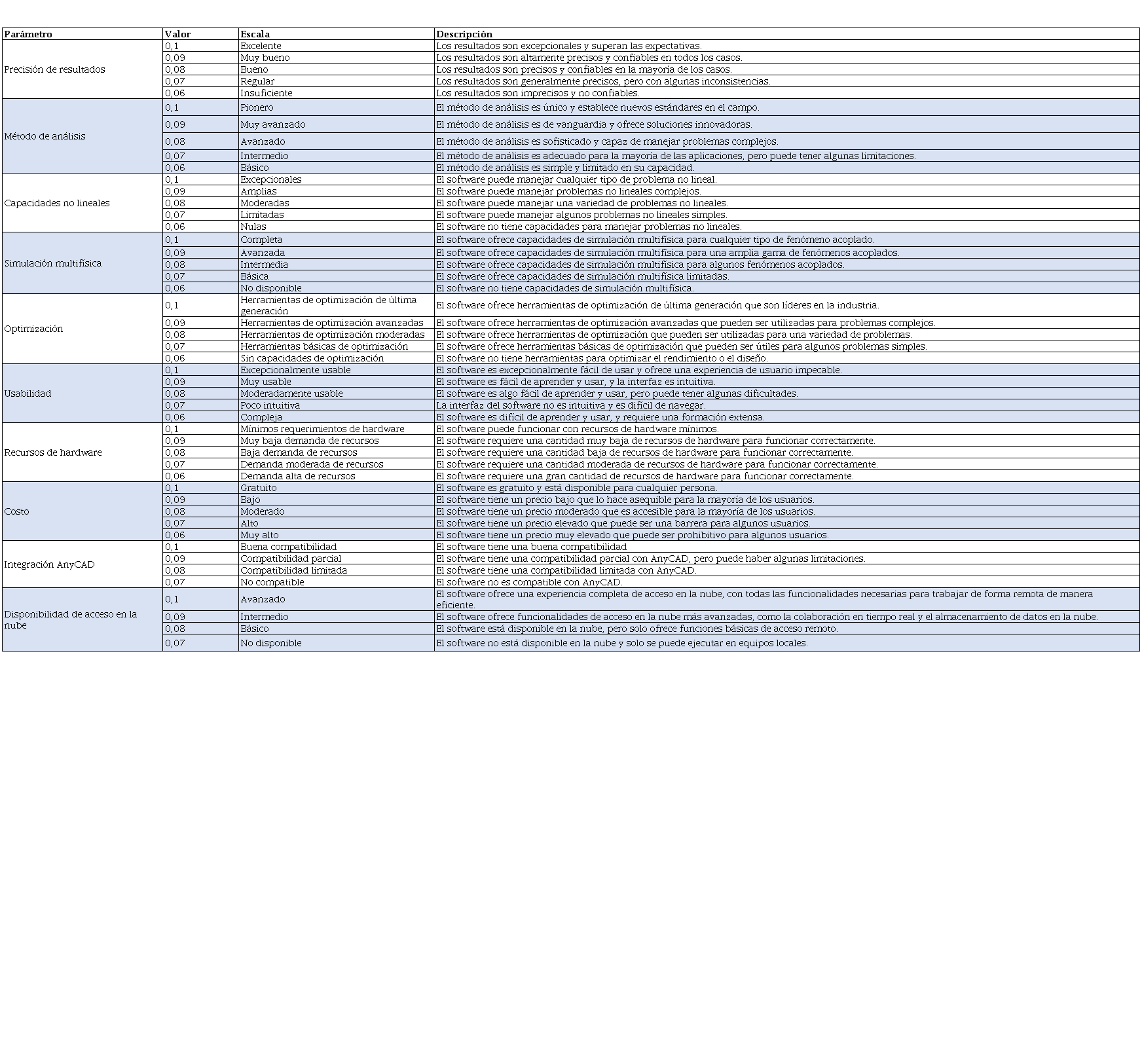 La evaluación cualitativa de los softwares se determinará en base a los siguientes parámetros detallados en la tabla 1: precisión de resultados, método de análisis, capacidades no lineales, simulación multifísica, optimización, usabilidad, recursos de hardware, costo, integración AnyCad y acceso en la nube.