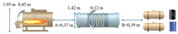 El presente estudio se desarrolló en la parroquia Sangolquí, cantón Rumiñahui perteneciente a la provincia de Pichincha, ciudad de Quito, Ecuador. Las coordenadas del sitio fueron 0° 22’ 0.3” S; 78°, 28’ 11.4” O. La planta piloto presentó las siguientes características: el reactor tiene una forma cilíndrica rectangular con una altura de 1,95 m y un diámetro de 0,45 m, mientras que el condensador tiene una altura de 1,42 m, un diámetro equivalente de 0,12 m. a una distancia A de 0,37 m y una distancia B de 0,39 m (ver Figura 1).