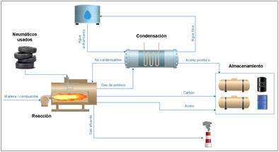 La planta de pirólisis se alimenta principalmente de tres tipos de entradas: neumáticos usados, madera/energía/combustible, y agua (ver Figura 3). Los neumáticos usados constituyen la materia prima principal para el proceso de pirólisis, mientras que la madera, la energía o el combustible se utilizan para alimentar el reactor y proporcionar el calor necesario para desencadenar la reacción de pirólisis. Se emplea agua como refrigerante en el condensador.