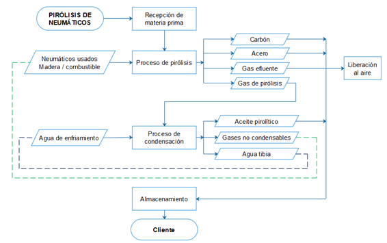 Este diagrama representa los recursos necesarios para cada subproceso que abarca la transformación de neumáticos usados en productos y subproductos útiles. Además, identifica las entradas, como los neumáticos usados, madera/energía/combustible y agua, así como los productos finales, subproductos y residuos generados durante el proceso.