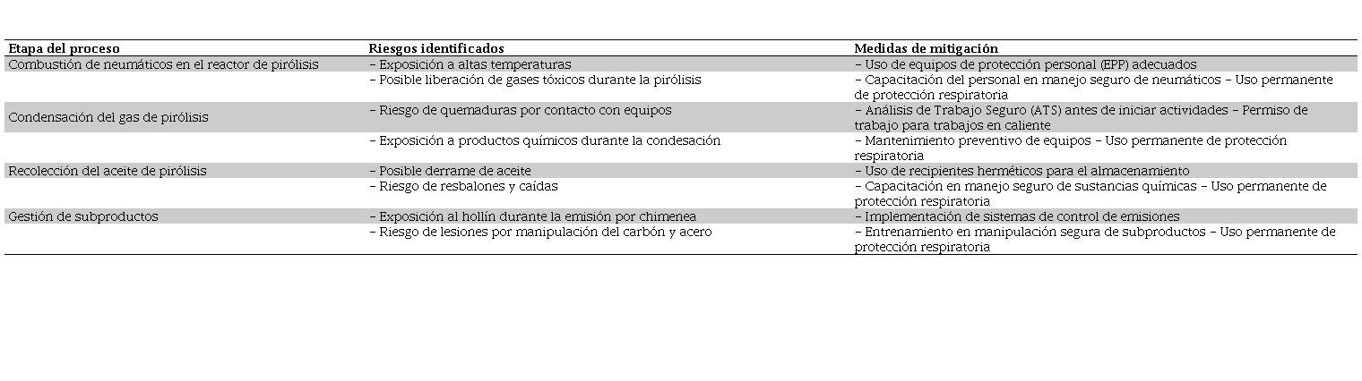 En la Tabla 1 se presentan los potenciales riesgos y medidas de mitigación en el proceso de producción de combustible alternativo mediante pirólisis de neumáticos usados.