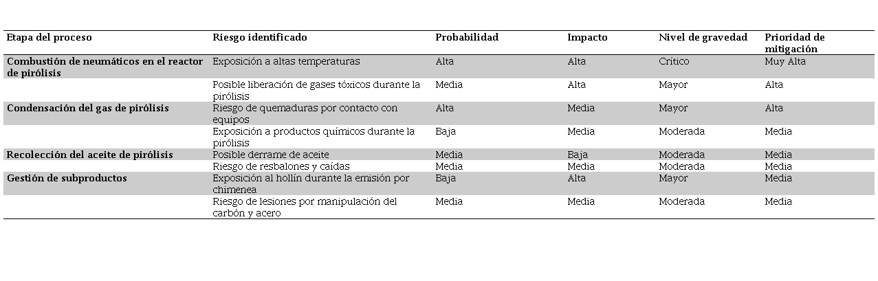 En la Tabla 2 se presentan los resultados del análisis de riesgos potenciales en el proceso de producción de combustible alternativo mediante pirólisis de neumáticos usados.