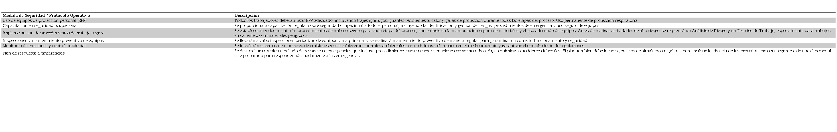 Finalmente, se propusieron medidas de seguridad y protocolos operativos específicos para garantizar un entorno laboral seguro en el transcurso de la producción y comercialización de combustible alternativo (ver Tabla 3). Estas medidas se basaron en los resultados del análisis de riesgos y las buenas prácticas en seguridad industrial.
