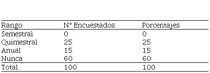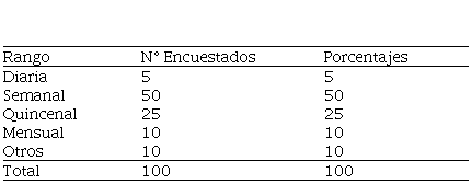 El 50% manifestaron que la frecuencia fue semanal, el 25% quincenal, 10% mensual, el 10 % especifico otros y el 5% diaria.