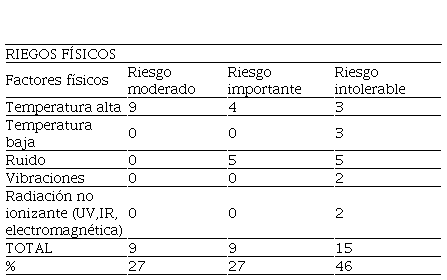 En la cualificación de riegos físicos, al analizar el factor ruido muestra un resultado de riesgo intolerable en las áreas de los talleres, ocasionado por utilizar algunos instrumentos de trabajo como el esmeril que sobrepasan el límite permisible para el oído humano en 85 dB según el decreto ejecutivo 255 de Seguridad y Salud en el Trabajo.