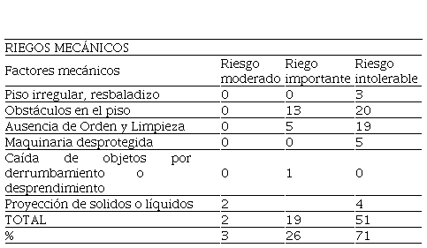 En la cualificación de riesgos mecánicos los factores obstáculos en el piso y la ausencia de orden y limpieza son los que más sobresalen como riesgos intolerables en áreas de los talleres.