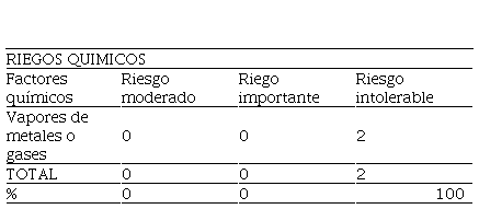 En la cualificación de riegos químicos el factor de vapores o gases muestra de dos puestos de trabajo se obtuvo un total de riesgo intolerable en ambos es decir 100%.