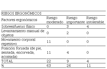 En la cualificación de riesgos ergonómicos los factores posición forzada y movimiento corporal repetitivo representan un riesgo moderado en 22 puestos es decir más del 63%, esto debido a que los trabajadores pasan mucho tiempo sentados de pie o encorvados.