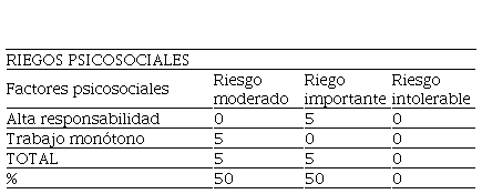 En la cualificación de riesgos psicosociales se puede observar que el trabajo monótono y las altas responsabilidades impuestas a los trabajadores muestran un resultado de 5 riesgos moderados e importantes, compartido en 50% cada uno de estos.